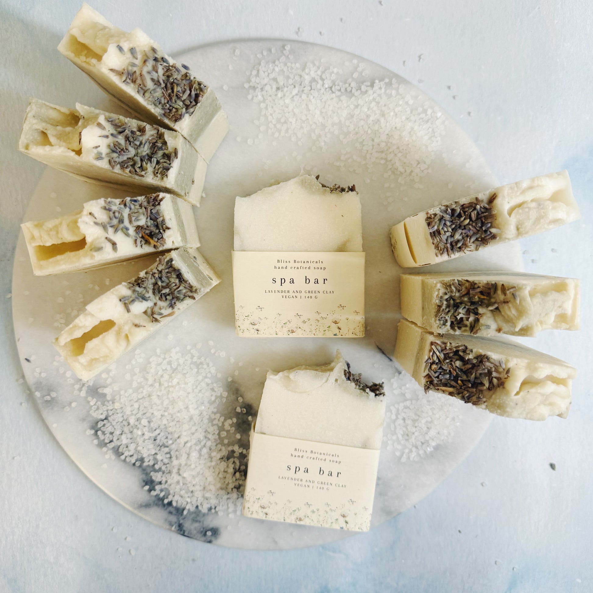 The Lavender and Green Clay 'Spa Bar' is a nourishing and moisturising cold processed soap made with a blend of mostly coconut oil, along with dead sea salt to make it gently exfoliating, layers of green clay and highly scented with pure Lavender Essential Oil.