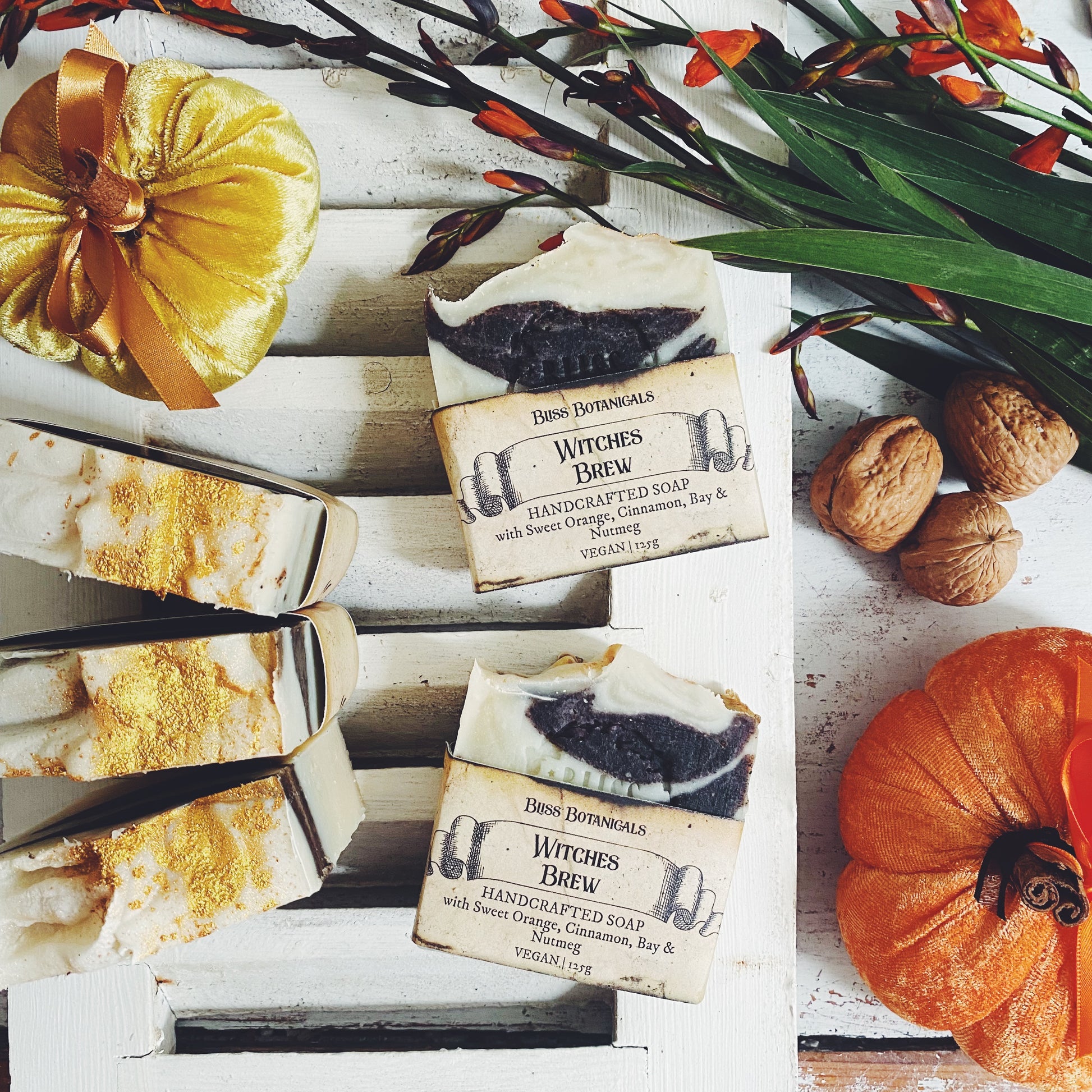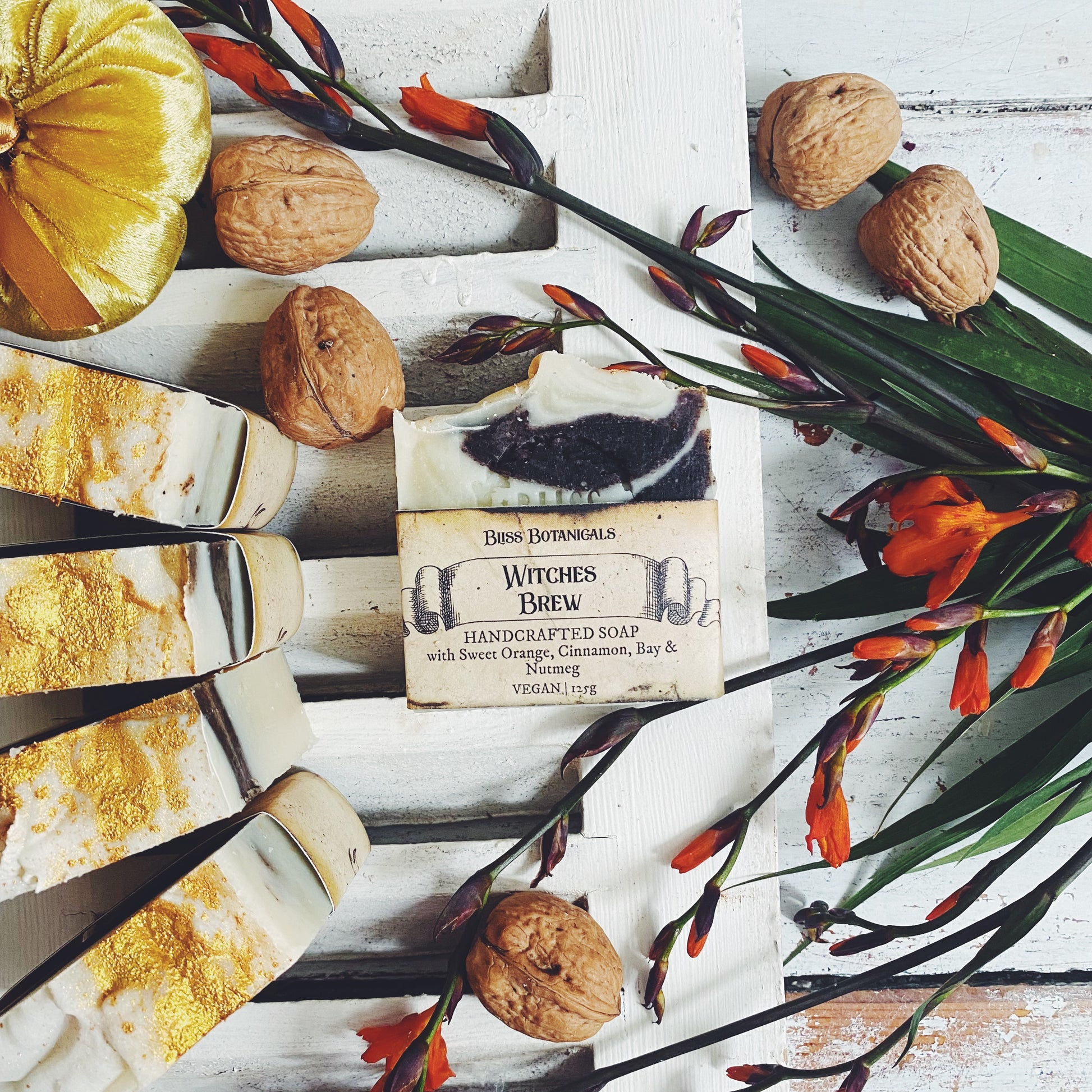 A magical mixture for the autumn months! Witches Brew Soap is a creamy and autumn treat, crafted with a nourishing blend of olive oil, coconut oil, shea butter, and castor oil. Infused with the warm, comforting fragrance of pure sweet orange essential oil, the soap is swirled with hints of cinnamon, nutmeg, and bay, and finished with a touch of gold sparkle. Perfect for adding a bit of magic to your skincare routine during the cooler months.